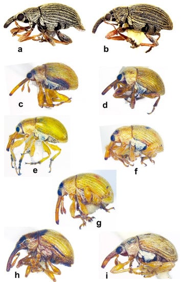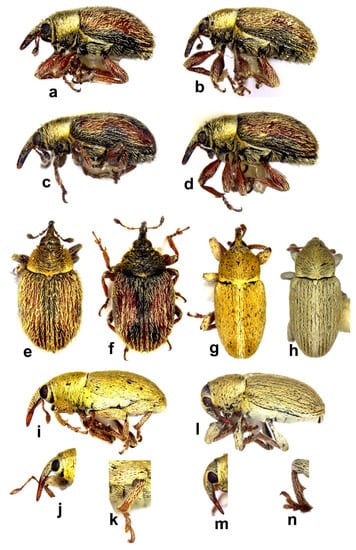 - Marvaldi, A.E.; Lanteri, A.A.; Guadalupe del Rio, M.; Oberprieler, R.G. 3.7.5. Entiminae Schoenherr, 1823. pp. 529–570. In Handbook of Zoology. Arthropoda: Insecta; Coleoptera, Beetles. Vol. 3. Morphology and Systematics (Phytophaga); Leschen, R.A.B., Beutel, R.G., Kristensen, N.P., Beutel, R.G., Eds.; Walter de Gruyter: Berlin, Germany; Boston, MA, USA, 2014. [Google Scholar]