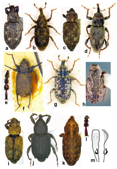 - Alonso-Zarazaga, M.A.; Barrios, H.; Borovec, R.; Bouchard, P.; Caldara, R.; Colonnelli, E.; Gültekin, L.; Hlaváč, P.; Korotyaev, B.; Lyal, C.H.C.; et al. Cooperative catalogue of Palaearctic Coleoptera Curculionoidea. Monogr. Electrón. Soc. Entomol. Aragon. 2017, 8, 1–729. [Google Scholar]
