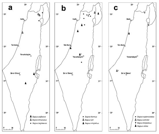 In Israel, the taxonomic knowledge on aquatic insects as a whole is limited. However, some groups, such as Ephemeroptera, Odonata, Trichoptera, Diptera (e.g., [,,,,,]), and some of the aquatic beetles [,,,,] have been studied and published. The aquatic weevil fauna in Israel nonetheless has remained completely unknown. The first records of water weevils in Israel were descriptions of Picia syriaca (Reitter) and Echinocnemus sahlbergi Shilsky. Since then an unidentified species of Bagous was recorded from the Hula Valley []. Caldara and O’Brien [] recorded five species of Bagous in their revision of the Palaearctic Bagous, based on the material deposited in European and American museums. Alonso-Zarazaga and Lyal [] recorded Aorus anthracinus Branczik; and Friedman [] recorded Arthrostenus fullo Boheman and Icaris sparganii (Gyllenhal). Comprehensive data on the distribution and biology (where available) of the hygrophilic species of Israel are presented here for the first time.