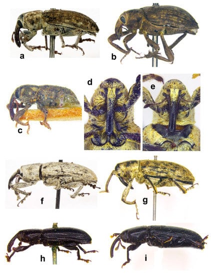 Drawings and measurements were made using a drawing tube and a stereomicroscope Leica M125, Leica Microsystems GmbH, Wetzlar, Germany. Drawings were scanned and processed using Adobe Illustrator 9.0, Adobe Systems Incorporated, San Jose, CA, USA. Total body length in dorsal view was measured along a straight line from the base of the rostrum to the tip of the elytra. Images of the weevil habitus were captured with a Leica DfC295 digital camera, Leica Microsystems GmbH, Wetzlar, Germany, mounted on a Leica M205c microscope, Leica Microsystems GmbH, Wetzlar, Germany, stacking images with Leica Application Suite 4.2.0, Leica Microsystems GmbH, Wetzlar, Germany, and Helicon Focus 5.3, Helicon Soft Ltd., Kharkiv, Ukraine, and editing the final images when necessary with Adobe Photoshop CS4 Extended, Adobe Systems Incorporated, San Jose, CA, USA. Genitalia were extracted by soaking dry specimens in hot water, removing the posterior abdominal sternites, and boiling them in a 10% water solution of potassium hydroxide. Extracted genitalia were preserved in glycerin in polyethylene stoppered vials, pinned next to the specimens. Photographs were made by the author, apart from Figures 1d,e and 4a,b,d,e.