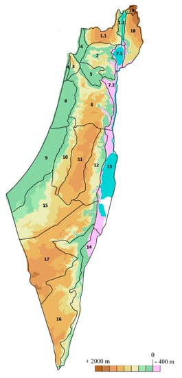 One of the earliest geographical descriptions of the Land of Israel, in the Book of Deuteronomy (8:7), refers to it as “a land with brooks, streams, and deep springs gushing out in the valleys and mountains.” The current State of Israel [] (matching partly the historical Land of Israel) is a country encompassing a Mediterranean-type, as well as semi-arid and arid climatic zones (Figure 17). A rapid rainfall gradient spreads along less than 450 km, from almost 1000 mm in the north to barely 20 mm in the south []. The northern part of the country (Galilee, Golan Heights, Upper Jordan Valley, Yizre’el (=Jezreel) Valley, Carmel Ridge), and the coastal plain and western slopes of the Samarian and Judean Hills possess typical Mediterranean vegetation (phrygana and batha), while the southern part (Negev Desert), eastern slopes of the Samarian and Judean Hills (Samarian and Judean Deserts) and the southern part of the Jordan Valley, Dead Sea Area and Arava Valley are semi-deserts or deserts with either steppe type (at higher altitudes) or eremic type vegetation. The coastal plain is fringed by a strip of sand dunes, wider in the southern part and tapering northwards, which in the past played an important role in the formation of the coastal swamps.