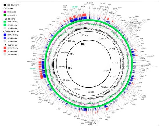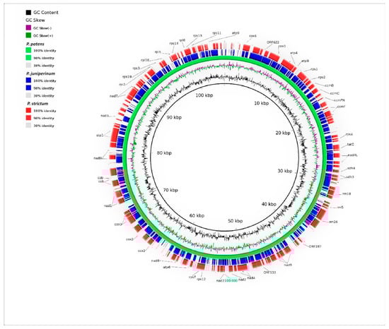 Blast Ring Image Generator output image of the draft mitochondrial genome. The internal rings represent the Physcomitrella patens genome (green). Basic Local Alignment Search Tool match of Polytrichum juniperinum and Polytrichum strictum are in blue and red gradient, respectively. The legend showing color gradient for percentage similarity between the reference and Polytrichum species. The referred mitochondrial genes are indicated around the map. The innermost rings show the GC skew (purple/green) and GC content (black).