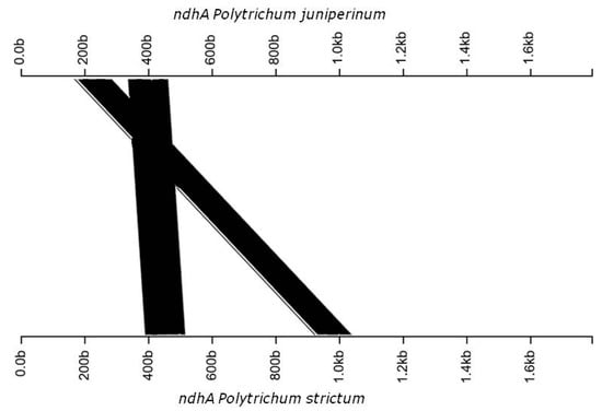 Our data suggests a possible absence of rpoA in the cpDNA P. juniperinum and P. strictum (Table 2). petN was absent in Syntrichia ruralis (Hedw.) F. Weber & D. Mohr [20] and Tetraphis pellucida Hedw. [21] and was probably translocated to the nucleus in P. juniperinum and P. strictum. The BLAST analyses showed that ycf66 had 90% identity among the Antarctic Polytrichaceae species. In P. juniperinum, this gene presented 100% identity with the homologous gene in Sanionia uncinata (Hedw.) Loeske, and in P. strictum, 94.3% identity with the homologous gene in S. ruralis. Some gene regions were found to have an identity lower than 90% when compared with the reference, for example, psaB, trnV, and ndhD (Figure 1). We also observed one inversion event in ndhA and ycf2 between Physcomitrella patens and both Polytrichum samples from Antartica (Figure 1) and (Figure 2 and Figure 3).