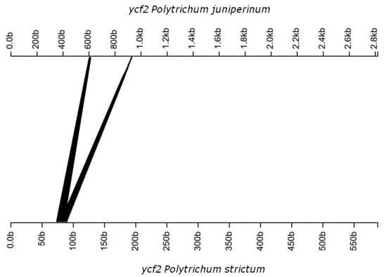 The chloroplast and mitochondrial genomes of P. juniperinum and P. strictum are identical with respect to overall gene content and structure, as shown in the maps; however, P. strictum genomes show lower degree of sinteny with the reference. We observed variations in the chloroplast genomes, for example, inversions. Inversions represent a type of rearrangement, and one gene inversions were observed in the cpDNA of P. juniperinum (Figure 3), which is not shared with P. patens/P. strictum, and one inversion between the cpDNAs of P. strictum (Figure 2) and P. patens/P. juniperinum. The gene content and gene arrangement of the chloroplast are highly conserved in land plants [64]. Large inversions and other chloroplast genome rearrangements are relatively uncommon among land plants [65], but small inversions are common and widespread in the plant plastid genomes and have been reported in a variety of plants, including bryophytes [66,67,68]. Generally, such small inversions provide a rather interesting phylogenetic marker between species, but also a vision of the relationships among groups. These inversions seem restricted to the species and do not characterize the genera. The mitochondrial genome shows conservation between Antarctic Polytrichum species. Previous studies have shown that the structural evolution of the mitochondrial genome is highly conservative not only within each individual lineage but also across mosses; however, this is most evident when compared with more distant orders within the large group Bryophyta that shows some rearrangements that are very conserved [50]. The occurrence of some rearrangements was observed between Marchantia polymorpha mtDNA and P. patens, as these species diverged more than 375 million years ago [69].