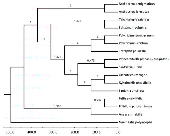 The phylogenetic analysis of the chloroplast included all assembly sequences from both species genomes. The plastid genomes of eight species, four species from the division Marchantiophyta, two species from Anthocerophyta, and the two Polytrichum species, were included in the analysis. Marchantia polymorpha L. were included as the outgroup, due to be the sister group of all land plants groups, as mosses and hornworts [33,34]. The majority-rule tree constructed with the plastid genomes showed branching into three clades, which is consistent with the taxonomic classification of the division Bryophyta sensu lato and Marchantia polymorpha as the sister group (Figure 4). Peristomate mosses [35] were resolved as a clade supported by 0.99 Bayesian posterior probability (pP), with the representatives of Sphagnum as the basal lineage. A sister relationship between P. juniperinum and P. strictum received high support (pP = 1). Furthermore, these species were grouped with T. pellucida, indicating Polytrichum as an apparent basal lineage; thus, the grouping characterizes the nematodontous mosses [8,36], supported by a pP of 1. This positioning is corroborated by other studies [37,38,39,40,41]. However, other authors have reported Tetraphidopsida as the basal group for Polytrichopsida [26]. The remaining species of the division Marchantiophyta formed a clade with little support (Pp = 0.60); however, this result is consistent with the phylogenomic study of Qiu et al [34]. Finally, Anthocerophyta species Nothoceros aenigmaticus J.C. Villarreal & K.D. McFarland and Anthoceros angustus Steph. formed a supported group (Pp = 0.93), and this is consistent with the findings of Qiu et al [34]. The tree topology showed no conflicting clade, corroborating the results of other authors [40,41,42].