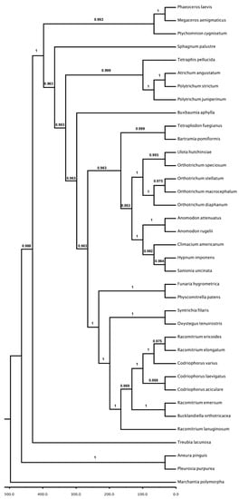 - Nishiyama, T.; Wolf, P.G.; Kugita, M.; Sinclair, R.B.; Sugita, M.; Sugiura, C.; Wakasugi, T.; Yamada, K.; Yoshinaga, K.; Yamaguchi, K.; et al. Chloroplast phylogeny indicates that bryophytes are monophyletic. Mol. Biol. Evol. 2004, 21, 1813–1819. [Google Scholar] [CrossRef] [PubMed]