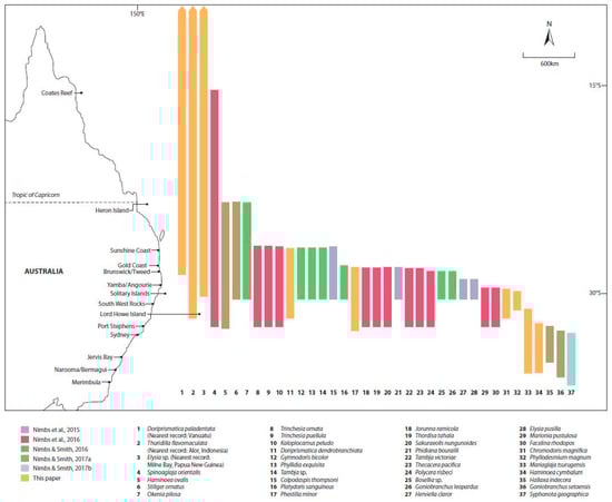- Nimbs, M.J.; Willan, R.C.; Smith, S.D.A. Range extensions for heterobranch sea slugs (formerly opisthobranch) belonging to the families Diaphanidae, Plakobranchidae and Facelinidae on the Eastern Coast of Australia. Mar. Biodivers. Rec. 2015, 8, e76. [Google Scholar] [CrossRef]