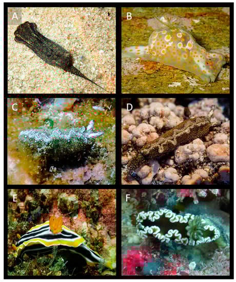 - Coleman, N. Nudibranchs Encyclopedia: Catalogue of Asia/Indo Pacific Sea Slugs, 2nd ed.; Neville Coleman’s Underwater Geographic: Springwood, Australia, 2008. [Google Scholar]