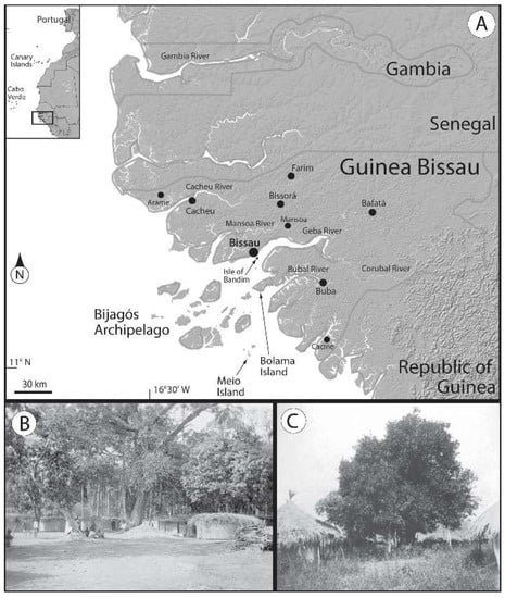 The signing of a treaty between France and Portugal in 1886, established the frontiers between French West Africa (Senegal and French Guinea) and Portuguese Guinea, and delineated a small Portuguese ruled enclave in Francophone Africa. The studies undertaken by the renowned French botanist, Auguste Chevalier (1873–1956) in French West Africa would mark the beginning of a revival of botanical explorations in the region []. Similar studies were also carried out by British botanists and large collections of specimens were assembled for West African flora in the 1920s and 1930s—including data from British, French, and Portuguese colonies [,] mainly kept at the Royal Botanical Gardens in Kew.
