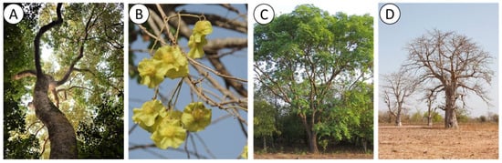 In the course of the 16th and 17th century as traders advanced deeper into West Africa by means of an elaborate network of rivers and sea inlets, their observations contain valuable insights into local vegetation, settlement, and cultivation patterns []. Besides abundant references in 16th century travel accounts to rice (Oryza spp.) and millet, the regions’ principal crops, such as the kola tree (Cola nitida (Vent.) Schott & Endl.) and indigo (Indigofera tinctoria L.) are also mentioned for the first time. Among the native trees, African rosewood (Pterocarpus erinaceus Poir.) (Figure 2B), the ordeal tree (Erythrophleum suaveolens (Guill. & Perr.) Brenan) whose bark was used to extract poison, a much appreciated, pear shaped yellow fruit (probably Gardenia ternifolia Schum. & Thonn), and the locust bean tree (Parkia biglobosa (Jacq.) R.Br. ex G.Don) (Figure 2C), stood out and were mentioned by the Portuguese explorer André Álvares d’Almada, 1594 []. Other contemporary travel accounts also referred a number of plants whose fruit and seeds were and are still widely used in the local diet or for phytotherapeutic preparations []. Donelha’s texts provided the first inventory of plant species from this area []. These include Guinea pepper or black malagueta (Xylopia aethiopica (Dunal) A.Rich.), the African fan palm (Borassus aethiopum Mart.), the copal tree (Guibourtia copallifera Benn.), strophanthus (Strophanthus hispidus DC. and S. sarmentosus DC.), and false yam (Icacina oliviformis (Poir.) J.Raynal). During the 17th century, travel accounts such as those by Lemos Coelho in 1669 and 1684 [] also mentioned a number of tree species common to Senegambia and West Africa, including the baobab tree (Adansonia digitata L.) (Figure 2D), the kapok tree (Ceiba pentandra (L.) Gaertn.), the locust bean tree and the Arabic gum tree (Acacia nilotica (L.) Delile).