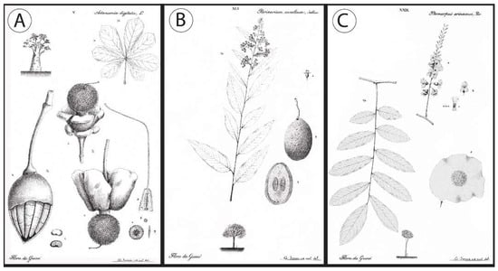During the first decades of the 1900s, linked to the operative occupation of territory by the colonial authorities, biodiversity, indigenous human settlement, and agricultural practices were documented in greater detail [,]. Joaquim Machado da Fonseca was probably the first collector who worked in the interior of the territory; from 1910 to 1915, he collected plants in different areas such as Cacheu, Arame, Bissorã, Mansoa Farim, Bafatá, Buba, and Cacine (see Figure 1A). Following these botanical incursions, other naturalists were charged by the Portuguese government to carry out reconnaissance missions in order to map the economic potential of agriculture and forestry of the territory, while also collecting plant specimens. The most important collections were assembled by António Figueiredo Gomes e Sousa in 1927 and 1928, and a few years later the agronomist Manuel Martins Baptista who travelled the colony between 1932 and 1934. Gomes e Sousa published the first comprehensive study of the territory’s flora and vegetation [], providing detailed illustrations of several plant species (Figure 3: Adansonia digitata—3A; Parinari excels—3B; Pterocarpus erinaceus—3C).