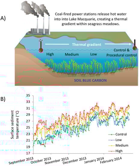 Seagrass meadows are regarded as one the most efficient and long-term organic carbon (Corg) sinks on earth [1,2], but disturbances could threaten this capacity [3]; therefore, understanding the effects of disturbance on Corg stored within seagrass meadows—termed ‘Blue Carbon’—is important. Warming represents one form of disturbance that will affect all of the ocean’s seagrass meadows. Warming can affect the Corg-sink capacity of seagrasses in two main ways. The first is through its impact on the plants themselves—e.g., by diminishing their biomass and photosynthetic capacity [4,5], leading to the loss of seagrass meadows and concomitant loss of sequestration capacity. The second is by stimulating microbial activity within the sediments beneath seagrass meadows, which is where the majority of Blue Carbon reserves are held [1,2], and therefore where the greatest immediate impact of disturbance typically manifests. For example, Macreadie et al. [6] reported loss of ~1000 years’ worth of sediment Blue Carbon within 50 years of a disturbance to a large seagrass meadow on the east coast of Australia, and found high proportions of microbes (aerobic heterotrophs) typically associated with Corg break down or decomposition (remineralisation) in those disturbed areas. The Corg-sink capacity of seagrass Corg stocks with respect to warming should therefore depend on both the plant and soil microbe responses.