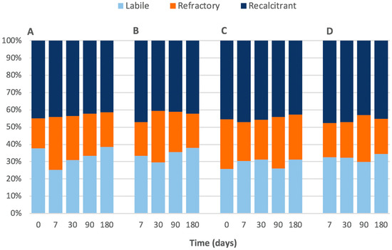 Thermogravimetric analysis (TGA) showing the labile, refractory, and recalcitrant percentages of organic carbon in the 0–0.5 cm portion of (A) procedural control and (B) high treatment, and the 8–10 cm portion of (C) procedural control and (D) high treatment.