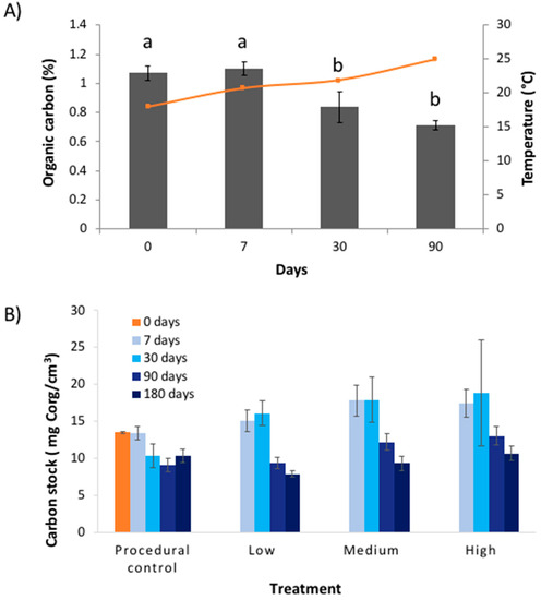 Results (mean ± SE) of experimental warming study showing: (A) change in the percentage organic carbon (all treatments pooled) within seagrass soil cores against time (‘days’), overlayed with temperature (orange line); and (B) change in carbon stocks for the different treatments and times. Letters above bars in (A) indicate differences according to Tukey HSD test.