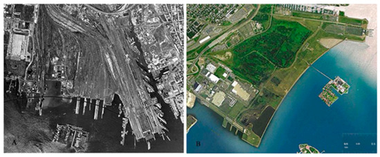 Located on the west bank of the New York Harbor, Liberty State Park was built on fill material deposited over a period of 70 years, beginning in 1860, by the Central Rail Road of New Jersey. By 1969 the railroad company had declared bankruptcy and removed most of the rails to be sold for scrap iron (A. Faircloth Aerial Image). Currently (B. Faircloth Aerial Image). The park has been developed around its perimeter using the traditional soil contamination mitigation methodology of capping. However, the interior 251 acres, shown in dark green, has remained undisturbed and has developed a robust and novel vegetative community. For more detailed maps describing recent vegetation and metals distributions across the site, please see [29].