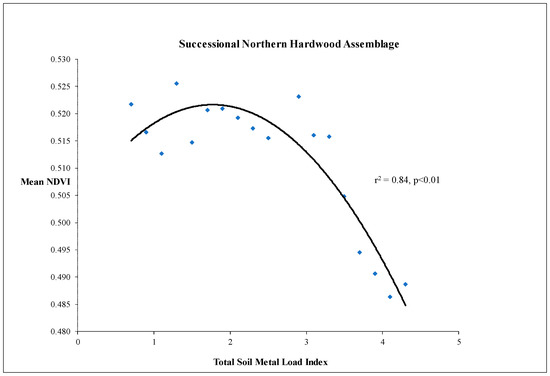 Polynomial regression between total soil metal load (TML) and diversity as measured by the Shannon index was significant only in the early successional hardwood tree community (SAS, 2003. Version 9. SAS Institute Inc., Cary, NC, USA). This suggests that the soil metal load significantly limited the establishment of tree species only at fairly high concentrations. The relationship between soil metal load and the early successional hardwood community diversity can be more accurately described using a threshold model.