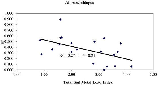 Primary production within LSP has been the subject of several studies and has been characterized using the Normalized Data Vegetation Index (NDVI) [30], Red/Green Ratio Index [32] and above ground biomass accumulation [46]. In general, all of these studies indicate that the relationship between soil metals and primary productivity is not linear and impacted at only the highest soil metal loads. Out of the 251 acres studied, only approximately 18 acres showed significant evidence of decreased primary productivity. To determine differences in productivity, the site was separated into the vegetative guild communities consisting of herbaceous, shrub and tree species. These were digitized and fit to a map of the site. By layering kriged NDVI values and kriged total soil metal load on the vegetative guild map, statistically significant differences in productivity were observed at total soil metal loads above 3.5 on a scale (approximately 18% of the site). This relationship was strongest in the successional hardwood forest guild. Furthermore, when fit to a second-order polynomial regression to simulate a threshold model, the successional northern hardwood forest yielded an r2 of 0.85 and a p value of >0.01 [30] (Figure 2). Neither the herbaceous or shrub guild yielded a significant relationship between productivity and soil metal load (Gallagher 2005 unpublished data) using the same methodology. Plant diversity, as measured by a Shannon index, and total metal load was also examined. In this case, a linear regression model was the best fit, and yielded a much weaker and relationship r2 = 0.27 and which was not statistically significant p = 0.21 (Figure 3). A plausible explanation for the differences between structure as measured by diversity and function as measured by productive could be that the site has a comparatively high sol metal load which selects for tolerant species. The resulting assemblages function well until a threshold is reached.