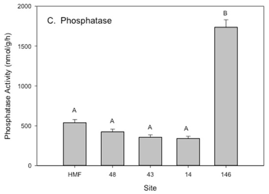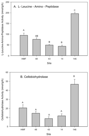 Soil free enzymatic response across a gradient of total soil metal load sites at LSP in addition to a reference site (Hutcheson Memorial Forest, HMF) that has no history of industrial use or metal contamination. The sites (HMF, 48, 43, 14, 146 (14/16)) are shown in increase in metal loads from left to right (and also see Table A1). Enzyme activities: (A) L-leucine amino peptidase, (B) cellobiohydrolase, and (C) phosphatase are representative are N, C, and P cycling respectively. Enzyme activities for all three enzymes were significantly (ANOVA performed in SAS Version 9.0) highest at the site with the highest total metal load (site 146 (14/16)). Data from [51].