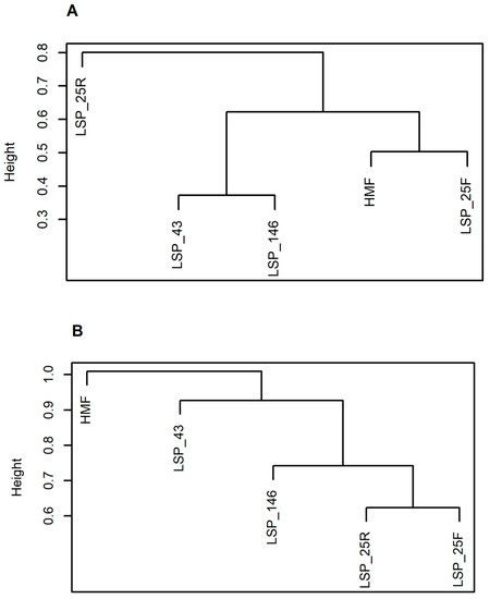 Dendrograms representing the relationship in microbial community structure for both bacterial (A) and fungal (B) communities, as analyzed by Ion torrent sequencing using 515f/806r primers for the bacteria and ITS1 primer for the fungi. Cluster analysis was carried out in R (R version 3.4) using the hclust command. Bray-Curtis dissimilarity of the relative abundances of bacteria and fungi was used for the cluster analysis.