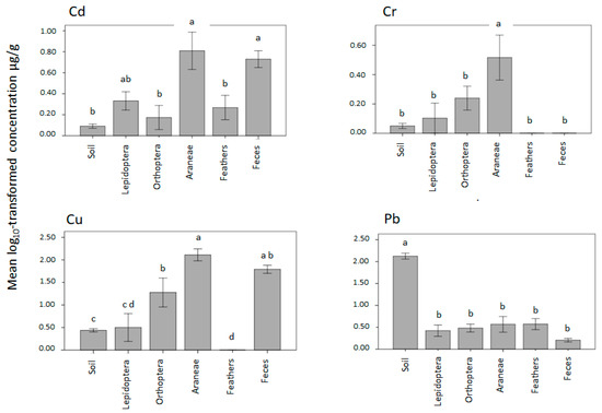 Log transformed mean concentration (µg) of Pb, Cd Cu, and Cr in Lepidoptera (n = 4) herbivores, Orthoptera (n = 9) omnivores and Araneae (n = 9) carnivore samples. Feather and fecal samples were taken from nestlings of Troglodytes aedon (House Wren), which feed heavily on Araneae. While the Araneae exhibited increased levels of of metals the variation was great, and transfer to the next trophic level, Troglodytes aedon did not occur.