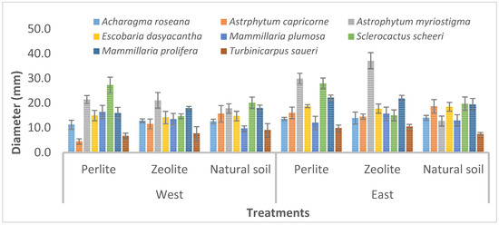 At the 24th week after reintroduction, the greatest diameter was recorded with A. myriostigma at the eastern sun exposure (51.20 and 42.63 mm, in zeolite/peat moss and perlite/peat moss, respectively), while the smallest value was recorded at the western exposure with T. saueri (8.45 mm in perlite/peat moss), as Figure 3 shows.