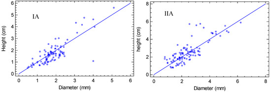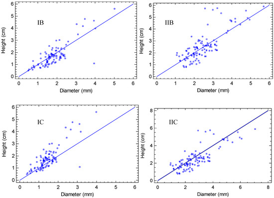 The growth parameters (diameter and height) presented a similar tendency in all combinations, with a positive relationship (p < 0.01) (Table 3). However, the west exposure (Figure 5IA, IB, IC) showed greater dispersion than the east exposure (Figure 5IIA, IIB, IIC); therefore, the east favors the harmonized growth of both diameter and height. This was reflected in the types of models obtained, being moderate in the west exposure, with r2 values of 63.49, 64.26 and 69.45 for natural soil, zeolite and perlite substrates, respectively. The highest value of r2 was obtained in the east exposure with zeolite (r2 = 80.07), emphasizing a close relationship among the two parameters in these conditions. However, the lowest value was recorded in the east exposure, with the natural soil (r2 = 38.16).