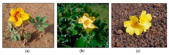 Examples of Cochlospermaceae: (a) herbaceous Amoreuxia wrightii flowering and fruiting in Nuevo Leon, Mexico; (b) Cochlospermum planchonii (sub-shrub) exhibiting characteristic large yellow flowers and palmately lobed leaves in Senegal, West Africa; (c) Cochlospermum tinctorium (sub-shrub) blooming straight from the ground after a savannah fire in Senegal, West Africa.