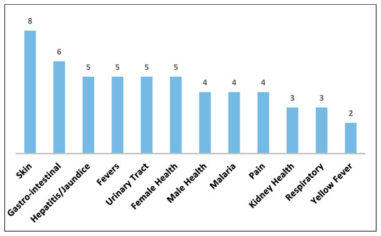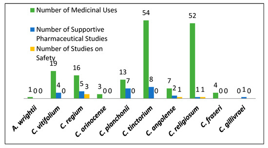 As well as illustrating the number of medicinal uses per species, Figure 3 also shows the number of pharmacological studies conducted which have tested the bioactivity of many of the species, including one species, Cochlospermum gillivraei Benth., that doesn’t have any documented medicinal uses. Many of these pharmacological studies found extracts from tested species to be potentially effective and safe medicines through in vitro and/or in vivo laboratory studies [42,48,50,51,52,59,60,61,72,83,84,85,86,87,88,89,90,91,92,93,94,95,96,97,98,99,100,101,102,103,104,105,106,107]. Cochlospermum tinctorium, from West Africa, was found to be the species with the highest number of medicinal uses and has been the focus of many bioscreening studies (Figure 3 and Figure 7).