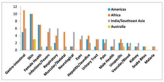 Number of different types of uses (y-axis) per major category of medicinal use (x-axis) for species of Cochlospermaceae in the Americas, Africa, India/Southeast Asia, and Australia.