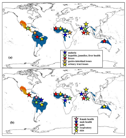 Comparing medicinal use throughout the geographic range of Cochlospermaceae. World maps illustrating general geographic regions where species of Cochlospermacea are being used to treat similar ailments: (a) malaria, hepatitis/jaundice/liver ailments, fevers, gastro-intestinal issues, and urinary tract issues; (b) female and male health issues, pain, respiratory ailments, and skin issues. Medicinal uses were divided between two maps to avoid overlapping stars.