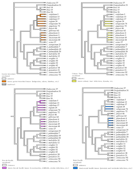 Medicinal uses (treatments for gastro-intestinal, urinary tract, female health, and male health issues) shared by two or more species mapped (as unordered character states) onto the Bayesian inference phylogeny of Cochlospermaceae of the combined nuclear (ITS) and plastid (trnG and trnL-F) regions from Johnson-Fulton and Watson [35].