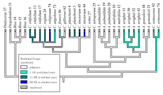 Medicinal uses were divided into the following categories: Gastro-intestinal, Respiratory, Kidney, Urinary Tract, Female Health, Male Health, Muscular/Skeletal, Infections/Fevers, Vascular/Blood, Hepatitis/Jaundice, Skin, Neurological, Pain, Snake Bites, Eyes, Malaria, and Unspecific. Selected medicinal uses of Cochlospermaceae were coded as character states and traced onto the previously published majority rule consensus tree resulting from a Bayesian inference analysis of the combined nuclear (ITS (internal transcribed spacer)) and chloroplast (trnG and trnL-F) DNA matrix by the authors of this paper, Johnson-Fulton and Watson [35], using MacClade 4 [36]. Exploration of character trait evolution was conducted using ACCTRAN optimization assuming Fitch parsimony, equal weighting of all characters, equal transitioning probability among all states, and characters as unordered.