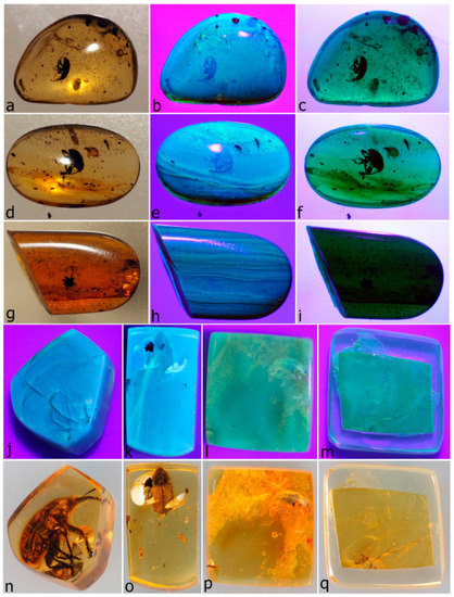 We checked the authenticity of all amber blocks available for study under ultraviolet light. Burmese amber is known to fluoresce in UV light, producing a pale milky blue colour when photographed [33,34]. The peak light absorbance of Burmese amber occurs at a wavelength of 380 nm [35], which is near the upper end of the range of UVA (near-ultraviolet) light (315–400 nm). As most commercially available UV lamps (‘black lights’) emit light in this range, they can be used conveniently to test Burmese amber. We used a 3 W 365 nm LED UV torch (TECH LIGHT) with a zoom lens and a 395 nm LED torch (SCORPION MASTER) for this purpose. The amber pieces illuminated with incident light from these torches appeared milky yellowish to bluish to the eye, but the images produced by a camera are pale bluish in colour. We photographed the specimens with an Olympus E-M1 digital camera, without using a flash. The amber pieces were placed on a non-reflective glass plate about 100 mm above the table surface, photographed first under white room light (Figure 1a,d,g,n,o), then under incident UV light (Figure 1b,e,h,j–m) and finally with UV light reflected from the table surface beneath the glass plate (Figure 1c,f,i). The amber produced the characteristic pale milky (opaque) blue colour only under incident light, whereas under reflected light it also fluoresced in blue but remained translucent. All amber pieces we tested with incident UV light in this way fluoresced in the characteristic milky blue colour, except those of Dominican amber, Baltic amber (Figure 1l,p) and Microborus inertus (Figure 1m,q), which all remained a dull yellowish-green under UV light, depending on the strength of the light, never fluorescing milky blue. As the Microborus amber piece is embedded in a thin block of artificial resin, we also tested a known burmite specimen (enclosing a staphylinid beetle) embedded in resin (and more deeply so, ~2.0 mm), and this glowed in the same characteristic blue as our Burmese amber weevil specimens did, indicating that the resin does not interfere with the fluorescence of the amber.