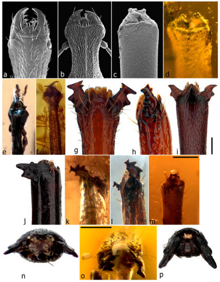 Apical part of rostrum showing mouthpart structures relevant to the classification of Burmese amber weevils. Basiliorhinus araucariae (Nemonychidae), dorsal view (a); Telala sp. (Anthribidae), dorsal view (b); Car cf. condensatus (Caridae), dorsal view (c); Petalotarsus sp. (Mesophyletidae), dorsal view (d); Guillermorhinus longitarsis (Nemonychidae), dorsal view (e); Burmonyx zigrasi (Nemonychidae), dorsal view (f); Rhodocyrtus cribripennis (Attelabidae), dorsal view (g); Rhodocyrtus cribripennis (Attelabidae), lateral view (h); Meriphus fullo (Curculionidae: Eugnomini), dorsal view (i); Ergania gibba (Curculionidae: Curculionini), dorsolateral view (j); Acalyptopygus brevicornis (Mesophyletidae), dorsolateral view (k); Louwiocis megalops (Mesophyletidae), lateral view (l); Elwoodius conicops (Mesophyletidae), dorsal view (m); Meriphus fullo (Curculionidae: Eugnomini), apical view (n); Habropezus kimpulleni (Mesophyletidae), apical view (o); Ergania gibba (Curculionidae: Curculionini), apical view (p). Scale bars: 0.1 mm (o); 0.2 mm (i,m).