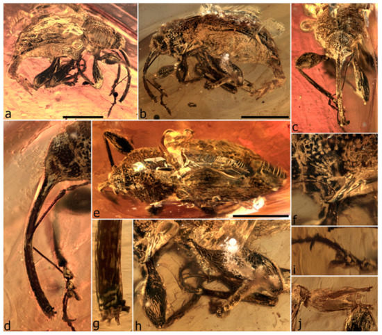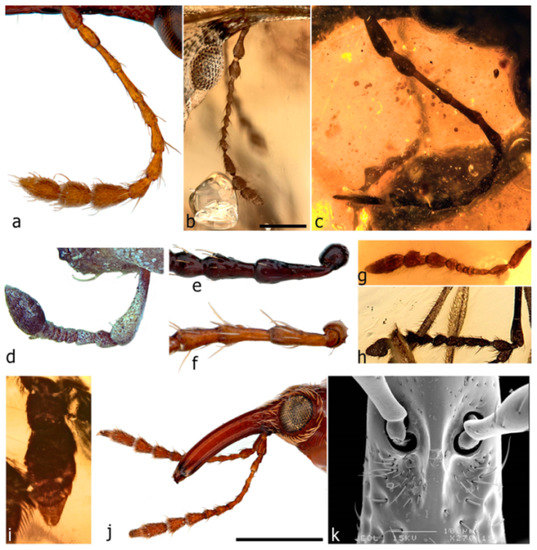 In the more primitive weevil families the antenna is straight, in that the scape is short and the pedicel (the first funicle segment) inserts into it in an apical position, its long axis aligning with that of the scape (Figure 5a). The term orthocerous (’straight-horned’) is used to described weevils with this type of antenna (it applies to the weevil, not to the antenna). In some genera of these families, in particular in Belidae and Caridae, the scape is slightly elongate (usually as long as the first two or three funicle segments) and its articulation with the scape more flexible (Figure 5j). This type of antenna is here termed subgeniculate, and it also occurs in several Burmese amber weevils (Figure 5b,c). In the large family Curculionidae, the scape is typically about as long as the entire funicle and the latter is held at about a right angle to the scape (Figure 5d). This type of antennae is referred to as geniculate (‘elbowed’), and weevils possessing it are termed gonatocerous. In the geniculate antenna of Curculionidae, the insertion of the pedicel in the scape is shifted into a ventral position, which allows the funicle to rotate forwards beneath the scape, and the ventral position means that the articulation socket is not visible (‘closed’) in apical view (Figure 5e). Even though curculionid antennae vary widely in shape, the ventral insertion of pedicel into scape generally remains, even in secondarily straight antennae (e.g., Brachycerini [39]). Geniculate antennae also occur in one other group of extant weevils, the subfamily Nanophyinae of Brentidae, but in it the geniculation is different in that the insertion of the pedicel in the scape remains in a more or less apical position, rendering the articulation socket visible (‘open’) in apical view (Figure 5f). The weevil fauna preserved in Burmese amber is remarkable for being the only other group of weevils with conspicuously geniculate antennae (it is by far the dominant type of antenna in the group), and these geniculate antennae are also of the ‘open’ type as in Nanophyinae (Figure 5g,h), not the ‘closed’ one of Curculionidae. The difference in the articulation type between the geniculate antenna in Curculionidae and in Nanophyinae and Mesophyletidae indicates that such antennae have evolved independently at least three times in weevils.