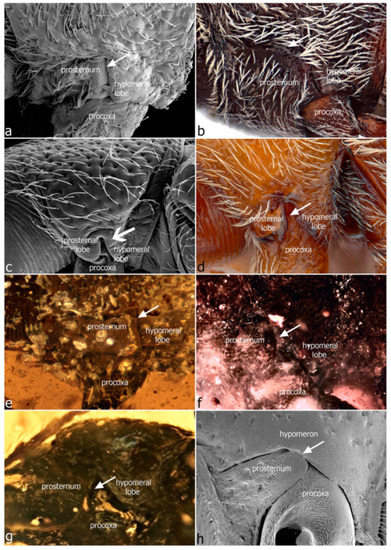 Important features of the pro- and mesocoxal cavities lie in their lateral closure. In most weevils the procoxal cavities are laterally (above the procoxae) closed by the juncture of the anterolateral part of the prosternum and the posteroventral part of the hypomeron (the hypomeral lobe), marked by the notosternal suture that typically extends more or less vertically for a short distance and then bends or curves anteriad towards the anterior prothoracic margin (Figure 7a,b,h). When the anterior prosternal and the posterior hypomeral lobes meet along their entire length along the vertical part of the notosternal suture, the suture (and the procoxal cavity) is termed closed. In most Belidae and Rhynchitinae of Attelabidae, however, the horizontal branch of the notosternal suture is obsolete and the vertical branch opened up, forming a narrowly triangular cleft that exposes the procoxal trochantin (or pleurotrochantin) (Figure 7c,d). In the vast majority of Burmese amber weevils, the notosternal suture is closed (Figure 7e), but in a few specimens it is distinctly open (Figure 7f,g).