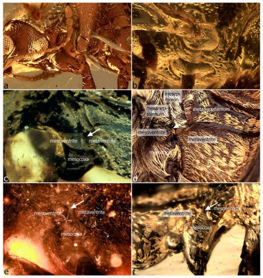 Procoxal and mesocoxal cavities in Burmese amber weevils. Confluent proxocal cavities (contiguous procoxae), Elwoodius conicops (Mesophyletidae) (a); separated proxocal cavities (procoxae), Petalotarsus oxycorynoides (Mesophyletidae) (b); closed mesocoxal cavity (suture arrowed), Acalyptopygus brevicornis (Mesophyletidae) (c); open mesocoxal cavity (suture arrowed), Hadrobelus undulatus (Belidae) (d); open mesocoxal cavity (suture arrowed), Platychirus beloides (Mesophyletidae) (e); open mesocoxal cavity (suture arrowed), Rhynchitomimus chalybeus (Mesophyletidae) (f).