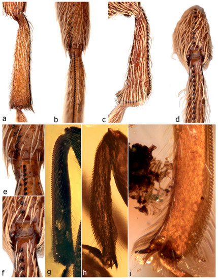 The shape of the antennal club also differs between weevil families, in that the club segments are distinct from each other (loosely articulated) (Figure 5a,j) in the more basal families but fused together (non-articulating) in Curculionidae (Figure 5d) and in some subfamilies of Brentidae (Ithycerinae, Microcerinae and Apioninae). In the Burmese amber weevils, the clubs are nearly always loose (Figure 5b,c,g,h), the only exception being the genus Petalotarsus, in which they are subcompact (Figure 5i), the segments not articulating though not as tightly fused together as they are in Curculionidae. As in weevils in general, the clubs of Burmese amber weevils are also four-segmented (in addition to a seven-segmented funicle) but generally much more distinctly so, with the terminal segment clearly inserted in the third (Figure 5b) and often conspicuously thinner (e.g., Habropezus tenuicornis, Figure 78), its base not being merely a constriction of the third. Even in species with subcompact clubs (e.g., Petalotarsus oxycorynoides), the four segments are clearly discernible (Figure 5i). In extant weevils, similar distinctly four-segmented clubs occur in some Anthribidae (e.g., Euciodes Pascoe), Caridae (e.g., Car pini Lea, Figure 5j) and even Curculionidae (e.g., Trichodocerus Chevrolat), whereas in Nemonychidae, Belidae and Attelabidae (Figure 5a) the distal two segments are seemingly always firmly fused and the presence of the fourth, apical segment is usually detectable only by the ring of sparse, long, erect sensory setae that occurs in about the distal quarter of all club segments, including the fourth. Even in the compact clubs of Brentidae and Curculionidae, the four segments are usually well discernible (Figure 5d).