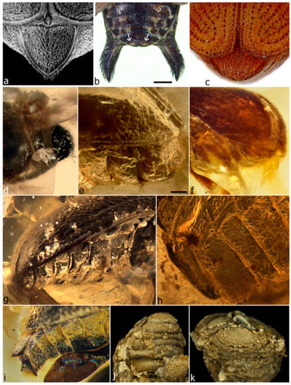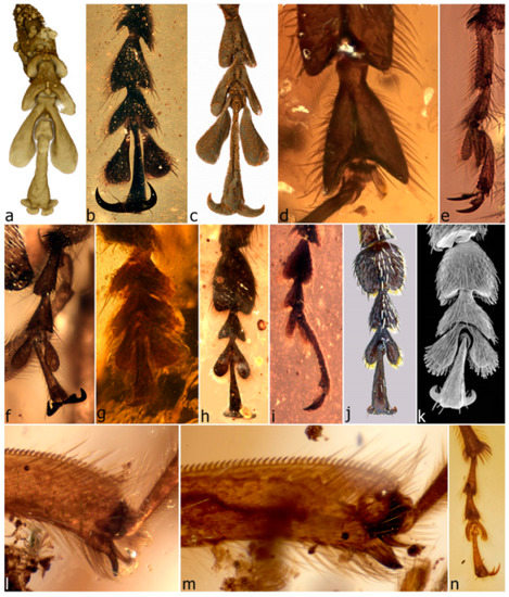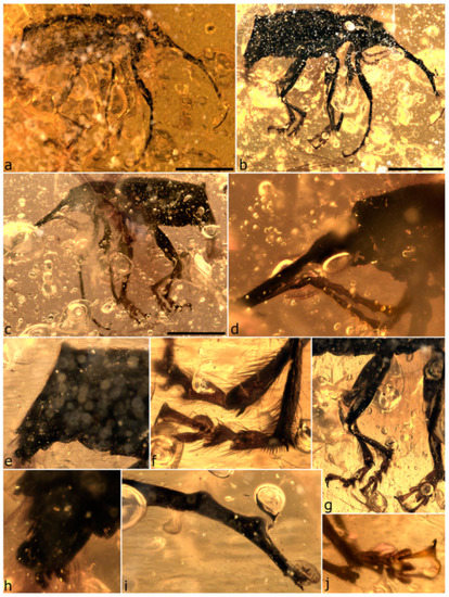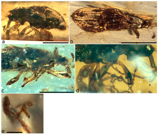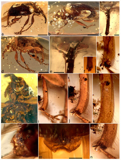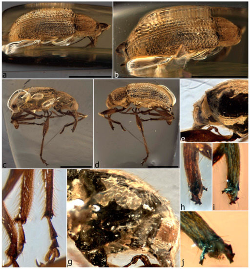 - Peris, D.; Davis, S.R.; Engel, M.S.; Delclòs, X. An evolutionary history embedded in amber: Reflection of the Mesozoic shift in weevil-dominated (Coleoptera: Curculionoidea) faunas. Zool. J. Linn. Soc. 2014, 171, 534–553. [Google Scholar] [CrossRef]