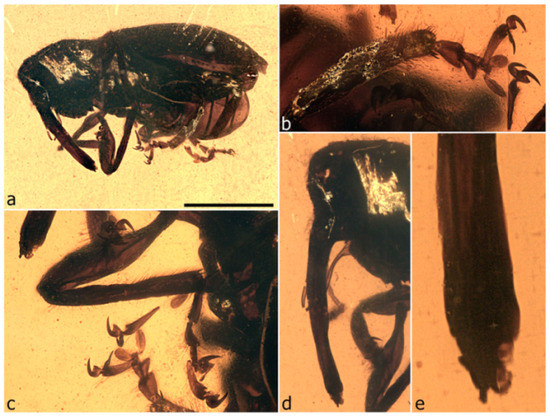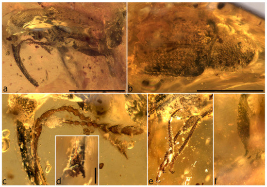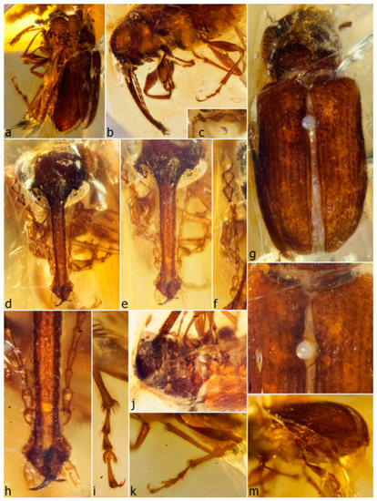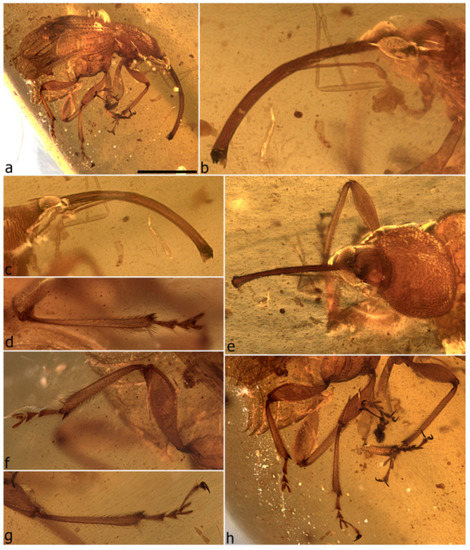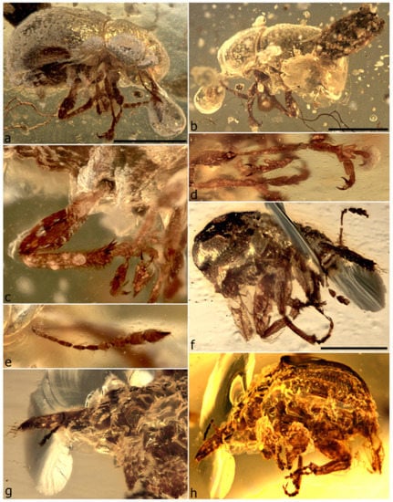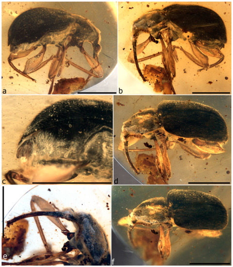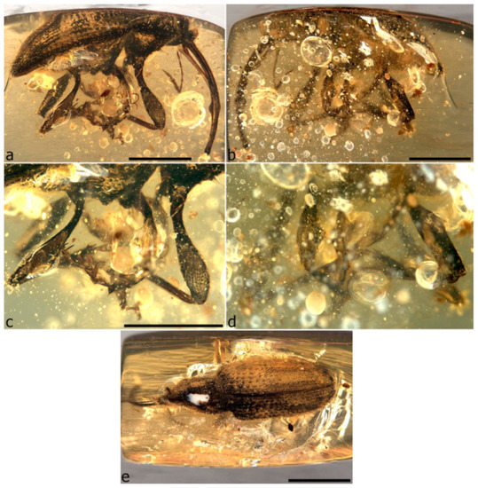 - Riedel, A.; dos Santos Rolo, T.; Cecilia, A.; van de Kamp, T. Sayrevilleinae Legalov, a newly recognised subfamily of fossil weevils (Coleoptera, Curculionoidea, Attelabidae) and the use of synchrotron microtomography to examine inclusions in amber. Zool. J. Linn. Soc. 2012, 165, 773–794. [Google Scholar] [CrossRef]