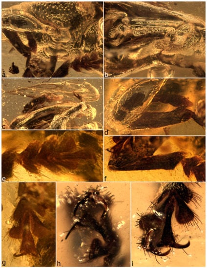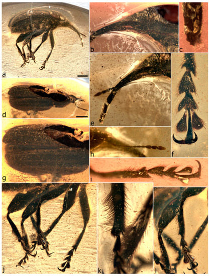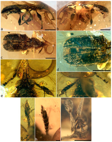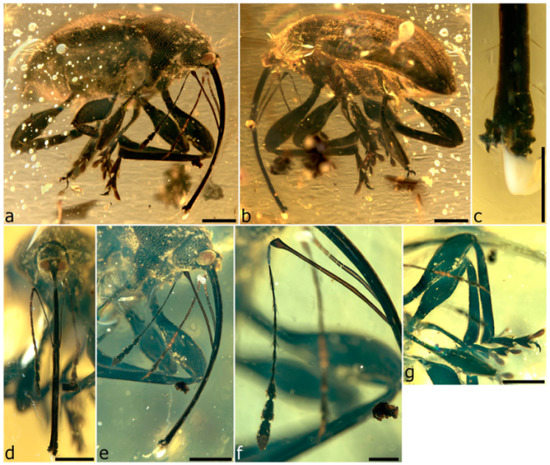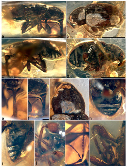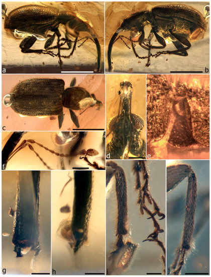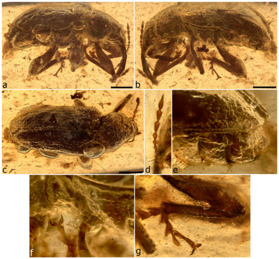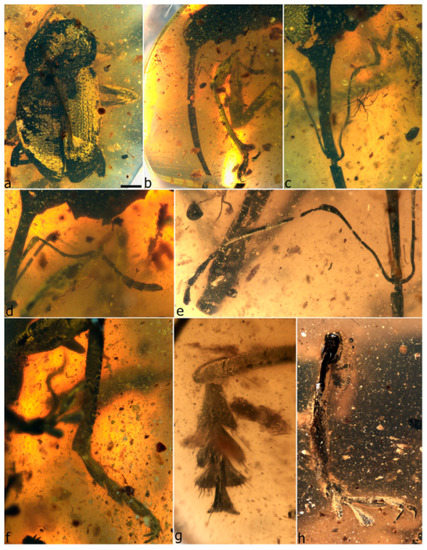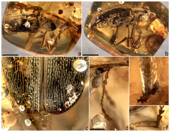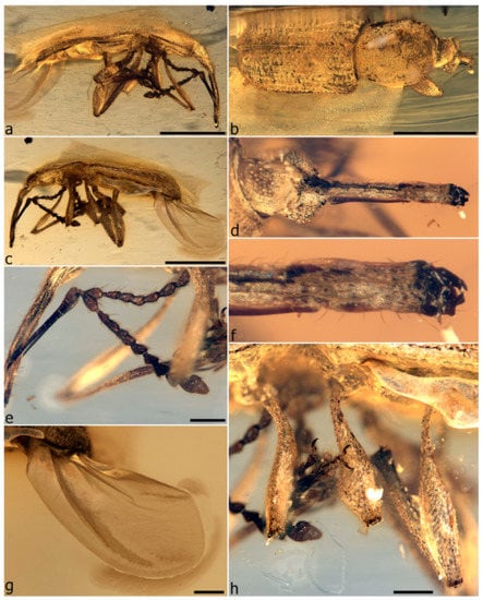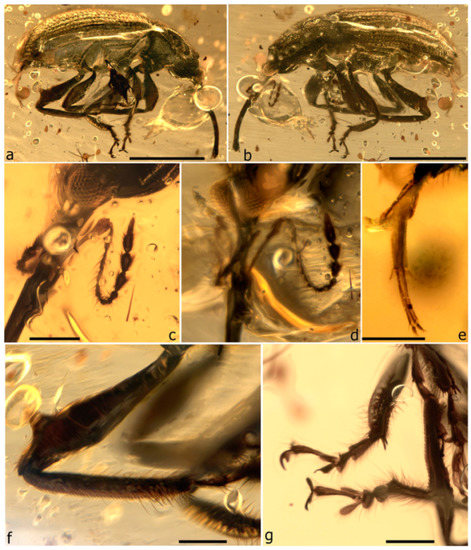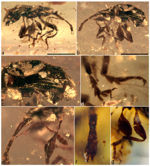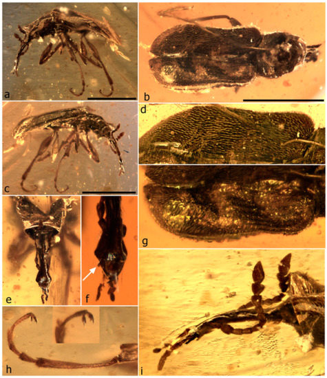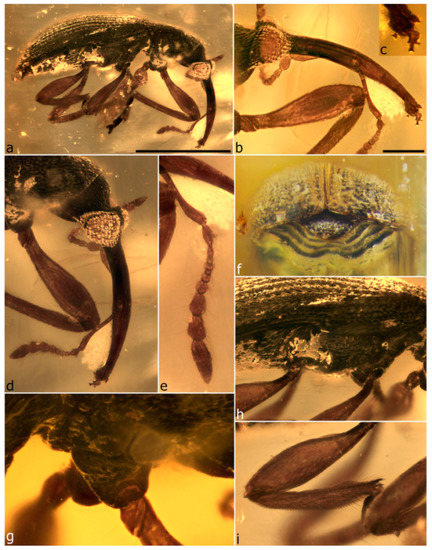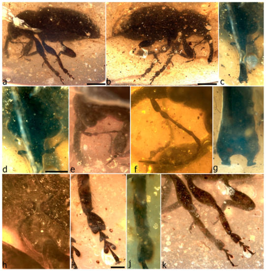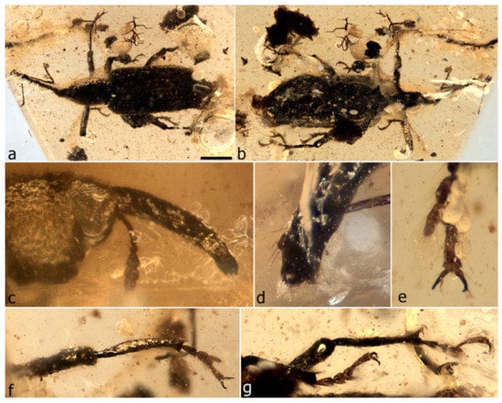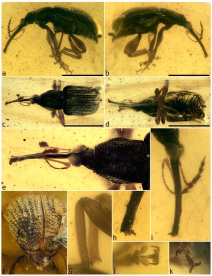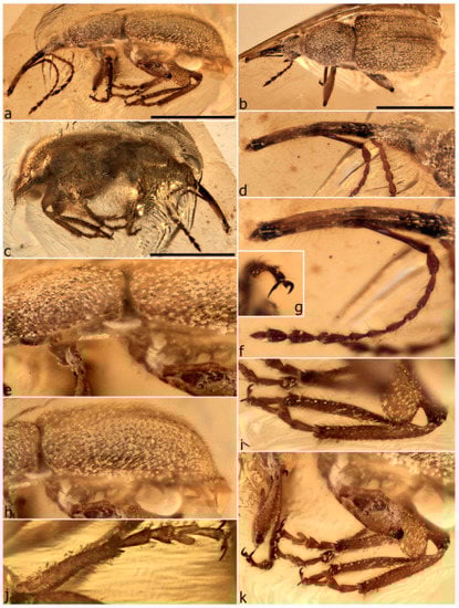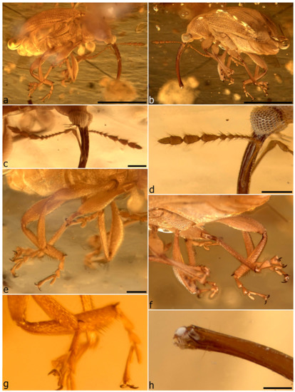 - Legalov, A.A.; Azar, D.; Kirejtshuk, A.G. A new weevil (Coleoptera; Nemonychidae; Oropsini trib. nov.) from Lower Cretaceous Lebanese amber. Cretac. Res. 2017, 70, 111–116. [Google Scholar] [CrossRef]