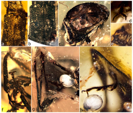 Obstructions in amber pieces obscuring critical taxonomic features of inclusions. Habropezus tenuicornis obscured by bubbles, flow lines and shearing plane (a); same, left side exposed after removal of excess amber and some bubbles and flow lines (reflection of shearing plane on right side of specimen reduced by different lighting) (b); Calyptocis brevirostris, irregular film of air obscuring elytra (c); Baltocar sp., white Verlumung obscuring right side of prothorax and structure of notosternal suture (d); Gnomus brevis, hazy cloud of organic particles shrouding specimen (e); Gnomus spinipes, imprint of specimen in amber after specimen pulled away from surrounding amber (f); Myanmarus caviventris, large fracture plane obscuring middle of left side and fine film of debris obscuring ventroposterior aspect (g); Mekorhamphus sp., badly distorted and compressed specimen with milky greenish film around thorax (h). Scale bars: 1.0 mm (a,b,e,f).