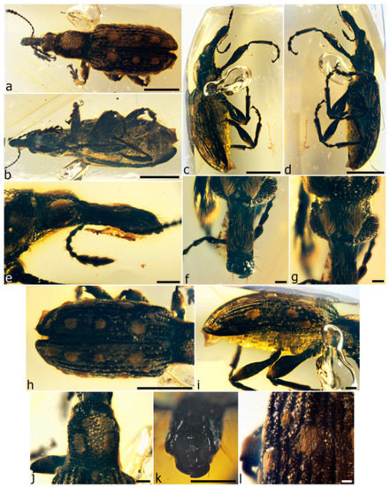 - Poinar, G., Jr.; Bown, A.E. Anchineus dolichobothris, a new genus, species and family of Early Cretaceous weevils (Curculionidae: Coleoptera) in Burmese amber. Proc. Entomol. Soc. Wash. 2009, 111, 263–270. [Google Scholar] [CrossRef]