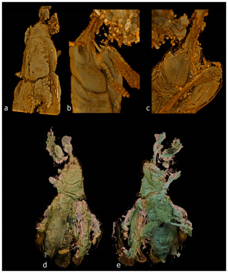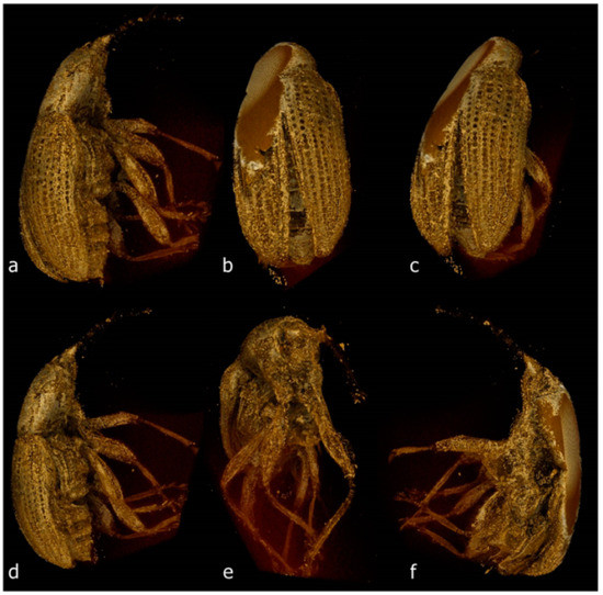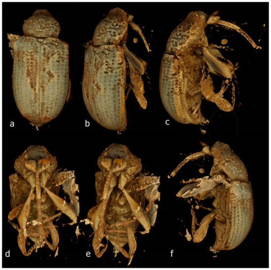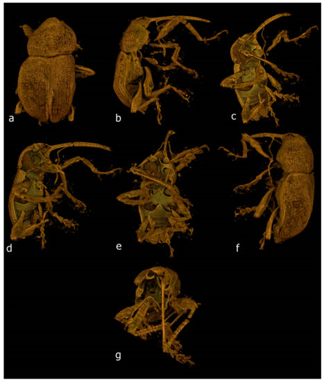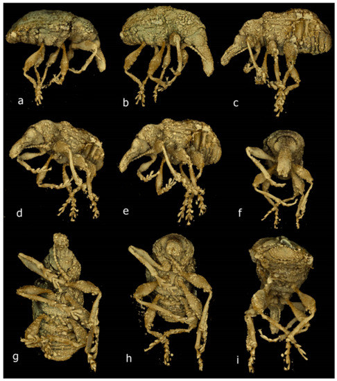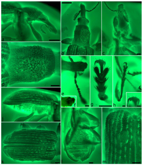- Caldara, R.; Franz, N.M.; Oberprieler, R.G. 3.7.10 Curculioninae Latreille, 1802. In Handbook of Zoology. Arthropoda: Insecta. Coleoptera, Beetles. Volume 3: Morphology and Systematics (Phytophaga); Leschen, R.A.B., Beutel, R.G., Eds.; Walter de Gruyter: Berlin, Germany; Boston, MA, USA, 2014; pp. 589–628. [Google Scholar]