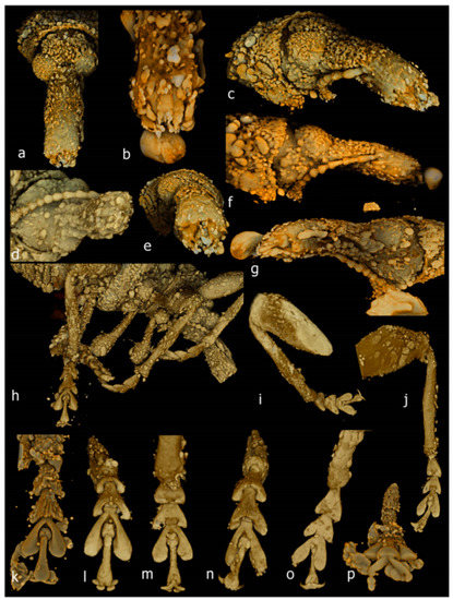 After initial study and photography, several specimens were scanned at the National Laboratory for X-ray Micro-Computed Tomography (CT Lab) of the Australian National University in Canberra (https://ctlab.anu.edu.au/capabilities/micro-ct.php) to reveal surface structures obscured by deposits or amber impurities too close to the specimens to be removable by grinding down the amber. The instrument used was a high-resolution micro-CT system (ANU4) with a double helical trajectory spanning 100 mm in height, a camera length of 315.4 mm and a detector resolution of 3k × 3k. The X-rays were generated by a Hama-L source, set at 80 kV and 55–60 μA beam current. The sample distance was 12 mm for small to medium-sized specimens and 13.2 mm for larger ones, and the field-of-view (FOV) dimensions were 13.5 mm width by 26.1–28.0 mm length for the smaller specimens and 14.8 × 21.2 mm for the larger ones, giving a voxel size of 5.3 μm for small to medium-sized specimens and 5.9 μm for the larger ones. Scanning time varied from 23 h for the larger to 32 h for the smaller specimens. Similar-sized specimens (amber blocks) were scanned together in a single tube of suitable diameter. The resulting 3D datasets were explored and rendered using the Volume Exploration and Presentation Tool of the open-source scientific visualisation software Drishti v2.6.4 [38], designed at the National Computational Infrastructure’s VizLab (https://github.com/nci/drishti). Drishti is a graphics, hardware-based, direct-volume rendering application for real-time exploration and presentation of volumetric data. It comprises a series of modules (Import, Render and Paint) and allows researchers to colour, render, cut, slice, explore and animate a dataset and then prepare images and videos for presentation and publication. The NetCDF files generated by the CT scanner were first imported into Drishti using the Import module, in which the amber pieces scanned in the same tube were digitally separated from each other. The individual data sets were read at low (8-bit) resolution, and contrast was incremented with the help of histograms and slides were filtered. The information thus generated is written as *.pvl.nc (xml) files, which were read in the module Render to generate volumetric images, using the transfer function to adjust a gradient of density until the specimen was visible and the image suitably cropped around it. The transfer function of Render was then used in high-resolution mode to tune visualisation as well as lighting and shading effects. For most of the specimens, it was necessary to combine different transfer functions. Images of different views and video clips (Videos S1–S7) were saved for each specimen where possible.