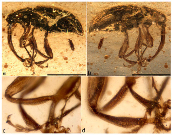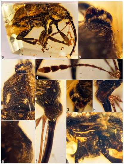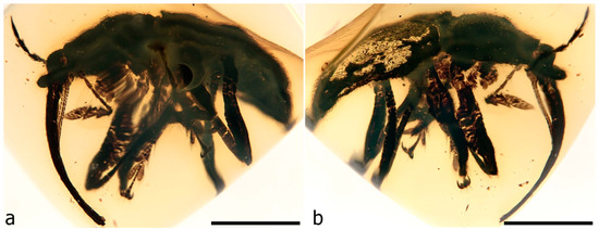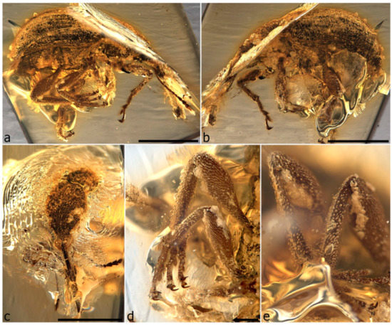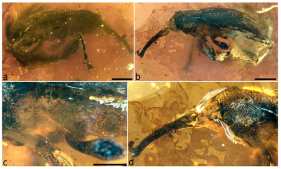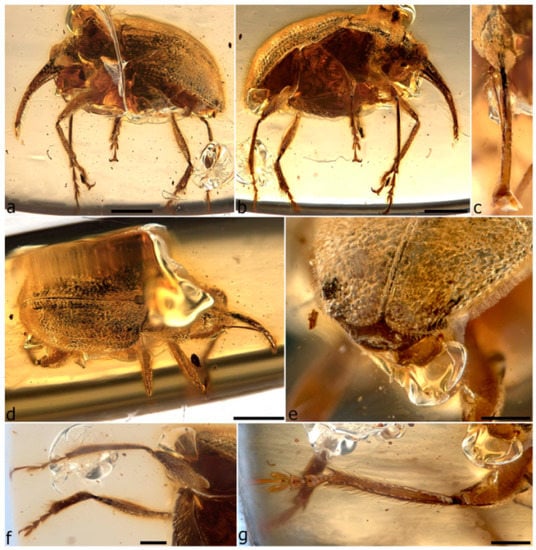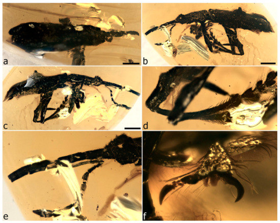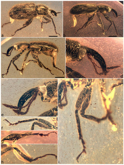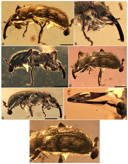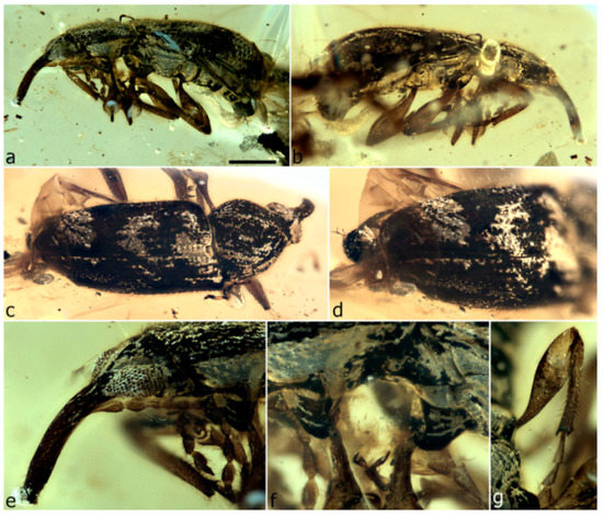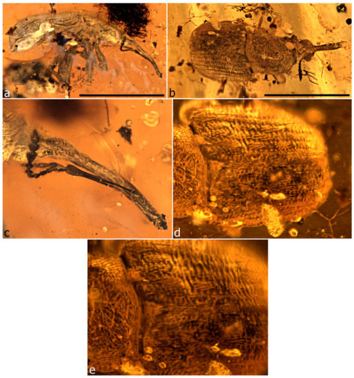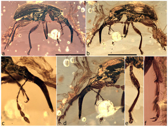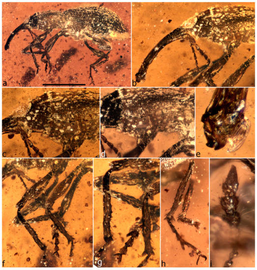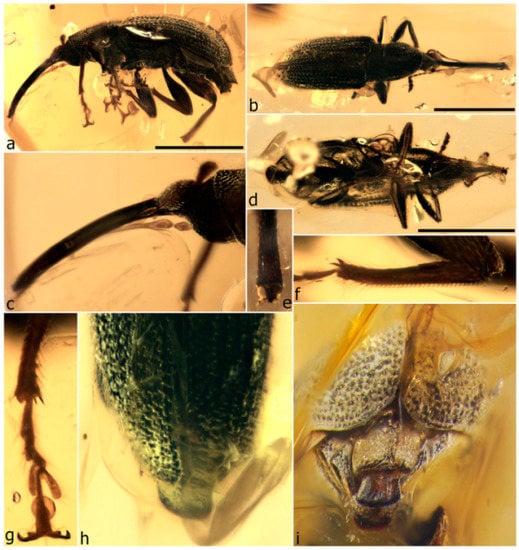 The first specimen in burmite to be described as a weevil was named Cryphalites rugosissimus and interpreted as a species of Scolytinae [28]. Its description and illustration are far too poor to ascertain its true identity, but a colour photograph published later supports the assessment that it is not a weevil but likely a colydiine zopherid [23]. The first definite weevil described from burmite is Mesophyletis calhouni Poinar, 2006, an unusual species in possessing geniculate antennae with loosely articulated clubs, exodont mandibles, serrulate tibiae with modified spurs, elongate-slender tarsi with very deeply bilobed third tarsites, and claws with bizarre dentition. Its generic name expresses the difficulty of placing it in any extant family, and a monotypic subfamily, Mesophyletinae, was erected for it, in a family called Eccoptarthridae [29]. Eleven further genera and species were described subsequently in isolated publications, in five different families: Burmonyx zigrasi Davis & Engel, 2014, Aepyceratus hyperochus Poinar, Brown & Legalov, 2017 and Burmomacer kirejtshuki Legalov, 2018 in Nemonychidae; Burmocorynus jarzembowskii Legalov, 2018 in Belidae; Mekorhamphus gyralommus Poinar, Brown & Legalov, 2016 and Habropezus plaisiommus Poinar, Brown & Legalov, 2016 in Caridae (as ‘Ithyceridae’); Anchineus dolichobothris Poinar & Brown, 2009 in Curculionidae; Burmorhinus georgei Legalov, 2018 in Curculionidae: Erirhininae; Palaeocryptorhynchus burmanus Poinar, 2009 in Curculionidae: Cryptorhynchinae; Microborus inertus Cognato & Grimaldi, 2009 in Curculionidae: Scolytinae and Palaeotylus femoralis Poinar, Vega & Legalov, 2018 in Platypodidae. However, very few of these family assignments are credible, because relevant family apomorphies were either not suitably demonstrated or actually misinterpreted. Many of these new taxa are similar to Mesophyletis in having geniculate antennae with loosely articulated clubs and are equally difficult to classify. Most intriguing are the species placed in extant subfamilies of Curculionidae, because dated phylogenetic analyses of weevils indicate these subfamilies to be younger than the middle of the Cretaceous [6,13,14,30]. None of these burmite weevil fossils have been re-examined and had their identities and/or provenance verified, which is of key importance for ongoing evolutionary studies of weevils, particularly for divergence time estimation, and some have unfortunately been used uncritically in divergence dating analyses (e.g., [31,32]), with likely significant impacts on resulting evolutionary scenarios [6].
