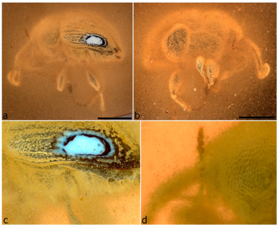 As typical for amber inclusions, critical structures and morphological characters were often not or only imperfectly visible in the amber pieces as received. This could be due to poor preservation of the specimen (compression, distortion or decomposition) or to impurities in the amber, such as bubbles of varying sizes and opacity, pieces of dark foreign matter (sometimes of a metallic nature), flow lines or shearing planes or cracks in the amber (sometimes visible by different colours of the amber) (Figure 3a) or a general cloudiness of the amber, which sometimes appeared as a greenish haze around the specimen (Figure 3h). It could also be due simply to the thickness of even relatively clear amber (without debris or obscurities) surrounding the specimen, which can cause it to appear blurred (especially at higher magnifications) due to the varying internal structure of the amber, the resulting varying optical clarity and available viewing angles. This alone, combined with potentially inadequate magnification and viewing techniques (dry vs. immersed in a liquid, the latter far superior), is likely an important factor in the omission or misinterpretation of several features in previously described amber weevil fossils and one for which different viewing techniques cannot compensate. Larger air bubbles can impede the view of some specimens due to the reflection of light from the inner bubble surfaces. Similarly, turbid (milky) impurities in the amber can restrict the visibility of specimens, and larger impurities and shearing planes close to the specimen sometimes can make it difficult to isolate structures (e.g., in Myanmarus caviventris; Figure 3g). A thin, continuous or fragmented film of air partially or substantially covers several specimens directly over the integument (Figure 3c,f), similar to the familiar Verlumung in Baltic amber but never of the same opaque, white, emulsion-like nature (Figure 3d). These layers may stem from gases released by the insect body or from slight movements (particularly of appendages) after embedding in the amber, and they were particularly troublesome in the study of the specimens as they completely obscure the underlying features and are not removable by cutting down the amber, as larger obstructions further away from the specimen often are. Additional difficulties in assessing the characters of the specimens arose from the lenticular or cabochon shape of most amber pieces as received. While this usually allowed a good view of the specimen from two sides (the flat sides of the lens), characters on the other four sides were often impossible to study due to the distortions created by the narrowly rounded edges of the lens and to the thickness of the amber along the sides. Many of these difficulties and obstructions could be overcome by trimming the amber block down into a cuboid aligned with the sides of the specimen, and sometimes difficulties associated with block curvature could be compensated for, in part, by viewing the specimen immersed in a liquid. Large bubbles approaching or reaching the specimen could sometimes be opened from the outside, cleaned out under ethanol using a very fine brush and then filled with clear polyester resin. Essentially, it proved impossible to properly study any specimen without trimming down the amber block as far as possible. The difficulty of handling very small amber pieces can be overcome by embedding them in a larger block of clear artificial resin, a method employed routinely at the AMNH [36] (this can be done with or without the aid of a vacuum pump). Such embedding also provides added protection for the specimen. Mounting small and fragile amber pieces between cover slips [37] will also stabilise them but has the significant disadvantage of precluding adequate views of the entire specimen.