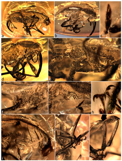 After initial inspection and photography, almost all amber pieces were further cut or ground down in places to remove bubbles and impurities in the amber, correct planes or curvatures that obscured or distorted critical features of the specimens or just reduce the thickness of the surrounding amber and improve the visibility of important characters. The best shape to study the specimens from all angles generally proved to be a rectangular block (cuboid) aligned with the dorsal, ventral, lateral, cephalic, and caudal sides of the specimen. The results of such trimming were often astonishing, rendering a specimen almost impossible to study (Figure 2a–c,e,j) into one revealing most of its critical structures (Figure 2d,f–i,k). Coarser cutting was done using a Dremel 200 or 4000 rotary tool, at low speed, fitted with a Dremel 545 Diamond Wheel (22.2 × 0.62 mm) for most cuts, or with a EZ545 blade (38.1 × 0.62 mm) when cutting larger pieces (we also used a ~1 mm blade), and mounted to a Dremel Workstation 220 in horizontal position so that the cutting could be viewed under a microscope. The edge and surfaces of these cutting wheels are impregnated with diamond and can be used both for cutting and for initial coarse grinding needs (other abrasives will also work for coarse grinding). Finer cutting was done by hand using an adjustable jeweller’s saw (3” throat depth) fitted with a #7/0 gauge blade (smallest blade size available for this saw). Surfaces were ground down (with or without prior cutting) using emery paper of 240 or 400 grit and subsequently smoothened using wet/dry emery paper of 800, 1200, 2000, 3000, 5000 and 7000 grit, usually under water and under the microscope at low magnifications. For final polishing we used either acrylic polishing paste (as used for polishing artificial resin; Vosschemie) or Dremel 421 polishing compound. A few inclusions had been cut or ground into during the original preparation; the resulting cavities were cleaned and then filled with clear polyester casting resin (Diggers Casting and Embedding Resin, Recochem Inc., Australia, http://www.recochem.com.au/files/downloads/Cons_Casting__Embedding_Resin_PDS_Apr11.pdf, and Castin’ Craft® liquid plastic) so as to seal and properly preserve the specimens. All this work was undertaken under a microscope, generally a Leica EZ4 and a Wild M3C instrument with Leica/Wild Planapo 1.0× objectives.