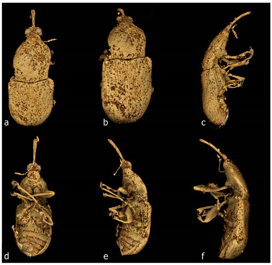 The first phylogenetic classification system for weevils was devised by G. Kuschel [1], who identified six major lineages (families). This classification differs from non-phylogenetic systems, which generally recognise a larger number of families and subfamilies, e.g., [8,9,10,11], but is now consistently reflected in the results of most modern phylogenetic analyses based on morphological or molecular data (e.g., [5,12,13,14,15]). The most recent higher-level classification of weevils [6] recognises eight extant families (Cimberididae, Nemonychidae, Anthribidae, Belidae, Attelabidae, Caridae, Brentidae and Curculionidae), raising the previous nemonychid subfamily Cimberidinae to family level. Differences among phylogenetic studies now seem to involve the placement of individual taxa rather than the basal branching patterns [2,13,16] (but see [6]). While few of these eight lineages have identifiable synapomorphies, their morphological definitions are robust, allowing for fossils to be reliably assigned to family group taxa provided sufficient characters are visible and interpretable.