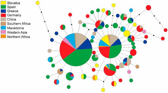 In total, we sequenced the mtDNA Cyt b and COI of 175 samples. We included samples of M. apiaster available in Genbank as well. Overall, we analyzed Cyt b of 299 samples. We found 48 polymorphic sites and 34 parsimony informative sites in Cyt b. The dataset shows substantial genetic variability. We identified 56 haplotypes, 22 of them with more than one sample. Two dominant haplotypes came from several localities in Europe, Asia, and Southern Africa: H1 with 77 samples from Greece, Spain, Macedonia, Germany, Turkey, Southern Africa and China; and H2 with 57 samples from Greece, Spain, Macedonia, Germany, Slovakia, Tunisia, Southern Africa and China (Figure 1, Table 1).